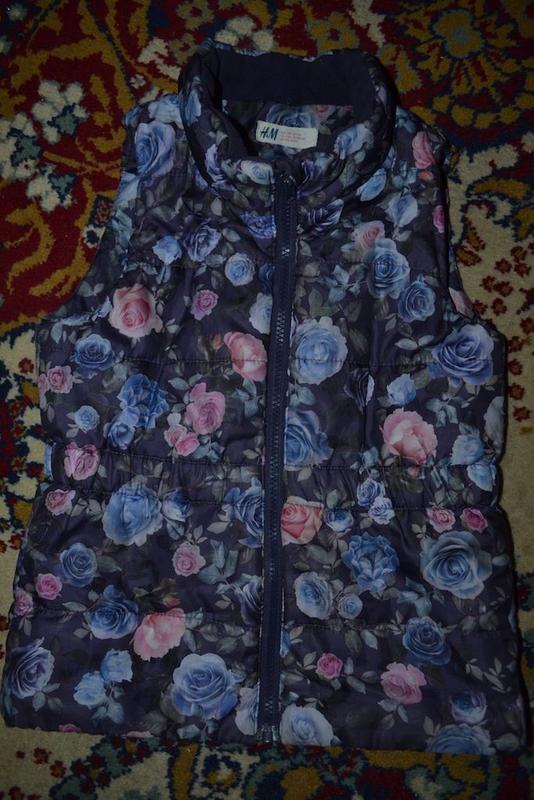 Красива брендовий жилетка в квітковий принт на дівчинку 7-8 років, ми одягали до 9 років. Тканина - плащівка водо-і вітростійким, утеплювач не товстий синтепон - підходить на осінь/весна. На замку спереду. В хорошому стані. Дуже зручна і легка (легка)! Мірки: Довжина 50 см, високий комір, ПОГ - 38 см, ПОТ - 34-35 див. Тканина: поліестер. Наповнювач: синтепон Дуже зручна і комфортна!