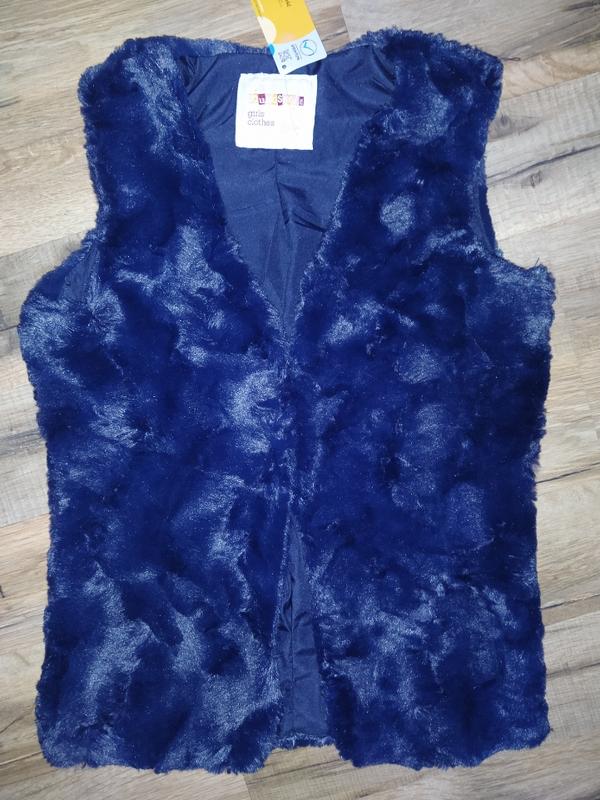 Хутряна м'яка ніжна осінь красива жилетка застібається на два крючечька !! колір в реальності темно синій з відтінком фіолетового фото не передає реальний колір!! якість супер!! сток з Польщі!! на зріст 122-128!!
