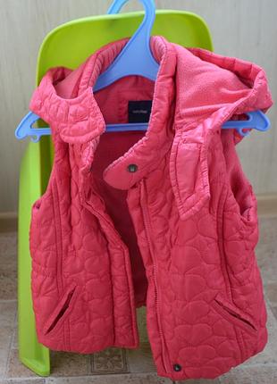 Яркий жилет для маленькой модницы от Baby Gap, размер 5 лет ( 115 см по бирке), носили и до 5 лет, ориентируйтесь на замеры: длина-39 см; -ширина под руками 34 см; -ширина по низу жилета 38 см. Жилет уютный, теплый, удобный: застежка на молнии и кнопках (вверх и внизу), капюшон пристегнут молнией, подкладка в жилете и капюшоне флисовая с тонким слоем синтепона, 2 кармана, по бокам приталенная резинками, внешняя сторона куртки прошита узорами-сердечками, непромокаемый материал. Состояние отлично, нет дефектов, молнии, кнопки цели. Самовозвивиз из Киева Пересилю Новой почтой, Укр-почтой за ваш счет, оплата на карточку ПРИНИМАНКУ, наложка только Новой почтой по подписке. Возвращение не предусмотрено.
