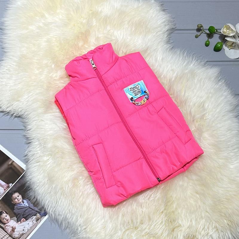 Жилет яскраво рожевий з крутою нашивкою. Застібка на замочку, є кишеньки попереду. Утеплена синтепоном. Виробник Туреччина Заміри: 104 - довж 38/напівобхв. 34 110 - довж 39/напівобхв. 35.