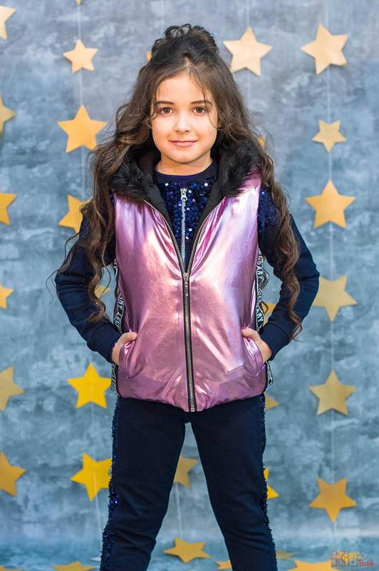 Приймаємо оплату карткою "Пакунок малюка". Жилетка модного блискучого рожевого кольору для дівчинки. Капюшон з опушкою з штучного хутра. З боків є врізні кишеньки. Застібається на блискавці. На зовнішніх швах пришито тасьма з принтом.