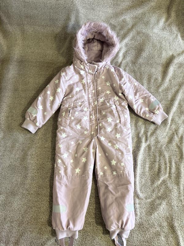 Зимовий комбінезон для дівчинки. 110 розмір. Дитині одягали протягом одного сезону. Довжина від плеча до низу штанини - 88 см. Рукав від шиї - 46 см. Крок - 41 см. Довжина від плеча до паху - 52 см. Утеплений синтепоном по всьому виробу, і флісом на спині та грудях|животику.