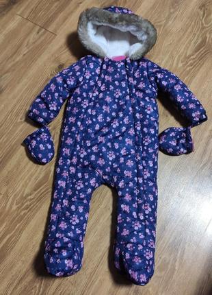 Яскравий комбінезон для дівчинки F&F baby еврозима 9-12 місяців в цілому стан відмінний: колір насичений, плям немає , микрофлис всередині не затертий ,обидві блискавки працюють, наповнення-синтепон - не збитий. ньюанс див. на останньому фото : є не значні 2 затягування нижче лівого плеча