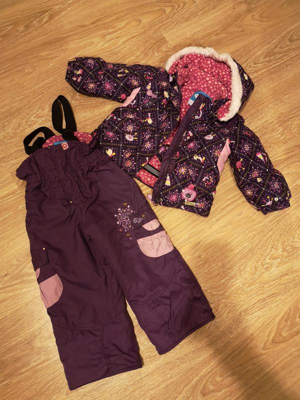 Теплий зимовий комбінезон трійка на дівчинку: куртка, штанці (лямки регулюються) і утеплені рукавиці. Самий класний комбінезон з усіх, що ми носили - швидко сохне, на ніжках є гумки, всі підкочується, тканина не мазка. Можна прати в машинці, ні колір, ні вигляд не змінився. Костюм полномерный, ми носили з 1,5 до 3,5 років, хоча вказаний розмір 2 роки. Заміри і фото за запитом.