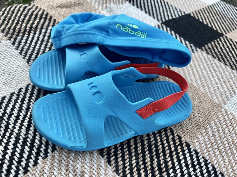 Взуття для плавання. Дуже зручне та легеньке. Розмір 27-28. Шапочка в подарунок. Ширина 42 см, але тягнеться.