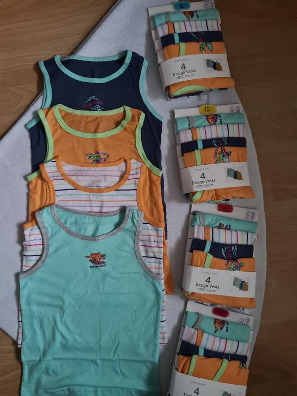 Майки фірми Primark куплено в Іспанії фірмовий магазин Набір складається з 4 шт Тканина 100% cotton Наявність розмірів 5/6 р 110/116 см На фото заміри розміру 5-6 р 110/116 см Додатково фото та заміри в пп Відправка нова або укрпошта Передоплата за доставку у дві сторони або повна оплата Натільна білизна не підлягає обміну та поверненню.