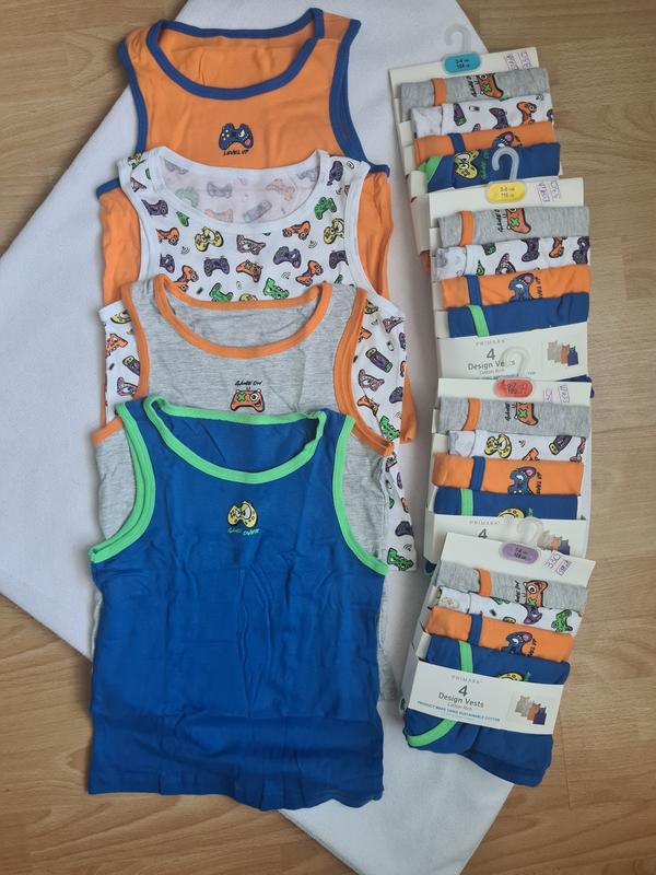 Майки фірми Primark куплено в Іспанії фірмовий магазин Набір складається з 4 шт Тканина 3×100% cotton 1×95% cotton 5% viscose Наявність розмірів 3-4 р 98/104 cm 4-5 р 104/110 см 5/6 р 110/116 см 6/7 р 116/122 см 7/8 р 122/128 см На фото заміри розміру 6-7 р 116/122 см Додатково фото та заміри в пп Відправка нова або укрпошта Передоплата за доставку у дві сторони або повна оплата Натільна білизна не підлягає обміну та поверненню.