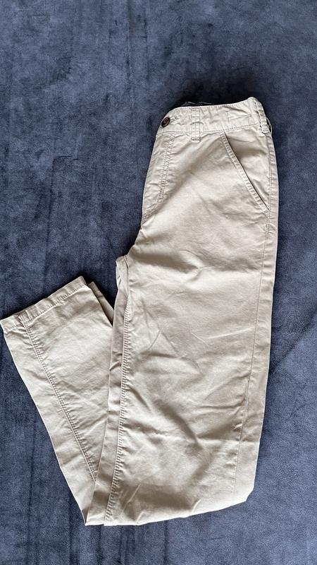 Брюки чинос у гарному стані. Модель трішки завужена до низу. Регульована еластична талія, застібка-блискавка з пуговкою, похилі бічні кишені, дві прорізані задні кишені. Вік 10-11 років. Зріст 140-146 Склад 100% котон Заміри: Довжина 93см, регулюється; Внутрішній шов 69см, регулюється; Напівобхват 40 см; Посадка спереду 24 см.