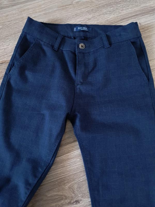 Штани ідеальні, одягалися тільки на виступи. Можна сказати, що вони майже нові, темно-синього кольору, довжина - 97 см, в поясі полуобхват - 34,5 см, в бедрах - 44 см, довжина ногавиці - 69 см. В поясі мають резинку.