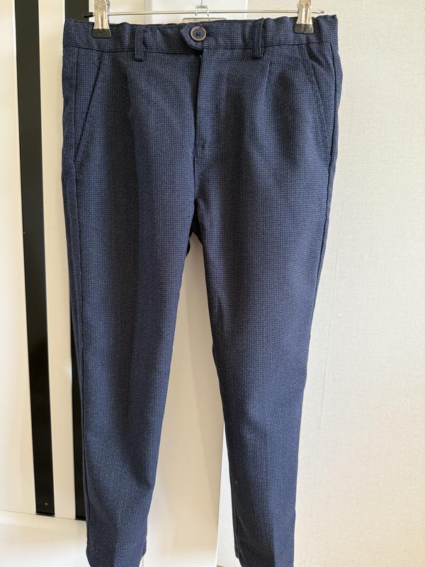 Крутезні брюки reserved на зріст 128. В ідеалі, хоча виручали нас кілька разів на знакові події . Ми їх брали на виріст з запасом, бо такі речі вдягаються два рази в рік, але їх треба. Вони були задовгі, але в ширині вони йдуть однакові, що на 122, що на 128, що на 134, ну хіба що є різниця в 0.5 см. В нас є пояс, нам було зручно, а довжину ми легенько приметали і заутюжили внизу. Далі 1 клас перше вересня і на 2й клас 1 вересня ми розметали по довжині і розгладили їх. Чудово сидять на дитині, матня не збирається, не мнуться. Вони не парять, тканина тоненькі, не тепла,,як може здаватися на фото.Колір синій, не на всіх фото він однаковий, бо вони не однорідні, легесенька чи то гусяча лапка, чи якийсь подібний узор - не знаю ,як назвати, дивіться фото. Найкраще колір показує на дитині. Купували за 900 грн.