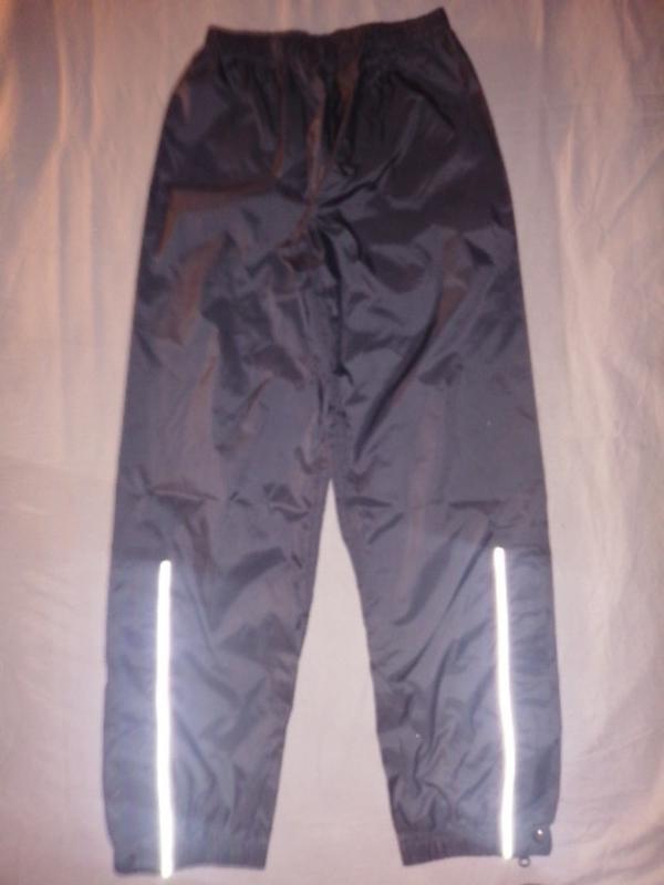 Серые штаны-непродувайки,, не промокайки. Пояс на резинке, без шнурка. Низ штанины на резинке + молния. В наличии светоотражающие елементы. Без карманов. Не утеплённые. Добротная и качественная фурнитура. Зсади на штанах емблема. Не новые, состояние идеальное. Замеры : длина изделия 91.5 см, внутренний шов 68.5 см, полуобхват пояса 27 см, тянется максимум до 44.5 см, полуобхват бёдер 49 см, полуширина штанины ляшка 29 см, низ до резинки 17 см, резинка 16 см, тянется максимум до 21 см, посадка перед 25 см, зад 30 см.