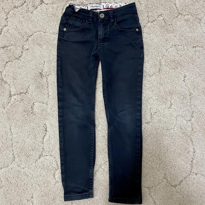 Наші улюблені темно сині джинси, виглядають більш матовими ніж на фото, більше схожими на брюки, тому носили в школу. Стан ідеальний. Носили в 6-7 років. Довжина - 69 см, Кроковий шов - 49 см, ПОТ - 26-30 см, (є резинка), Стегна - 34 см.
