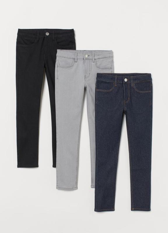 Набір джинсів HM, 13-14 років, в наборі 3 шт, ціна за набір 865 грн. Ціна за 1шт - 355грн.Пояс 38см, затягується на резинки, довжина 98см, шаг 73см, бедра 47см, ширина штанини знизу 14см.. Кольори: чорний, синій, сірий.