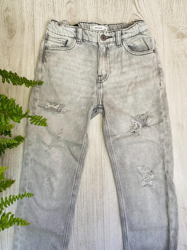 В ідеалі, світло сірі, розмір 134. Заміри: довжина 80 см, пояс 30 см