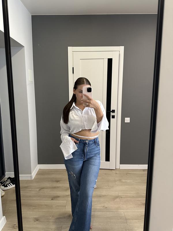 Джинси прямі до низу розширені та рубашка із завʼязками