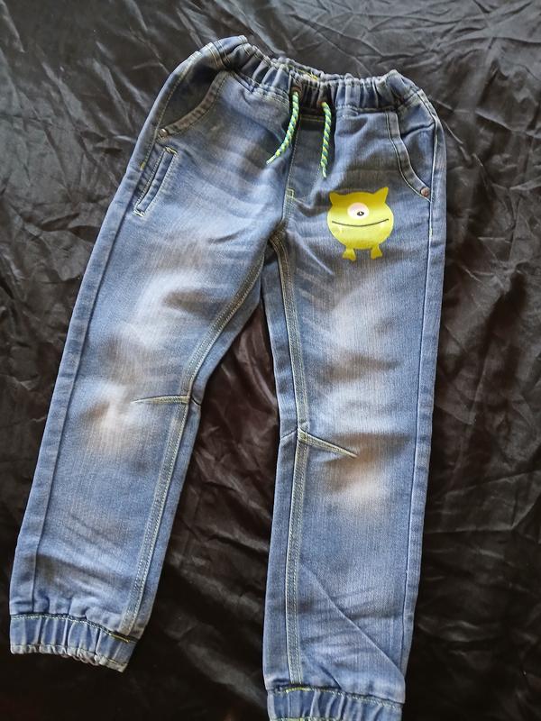 Щільний джинс, 3 кишені спереду + 2 ззаду. Куліска-декор, була вставлена гумка (можна розпустити). Стан - ідеальний. Відмінно підійдуть на холодну осінь, зиму. Розмір 116, дивіться виміри Довжина-68см Пот-22/32см Поб-36см