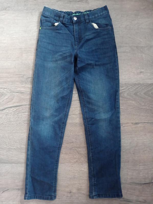 Джинси на хлопчика темно-синього кольору. Утеплені тканиною.Застібаються на блискавку та ґудзик.Спереду та ззаду по 2 кишені.На талії регульована гумка. є лямки для пояса. Склад: 69% котон, 30% поліестер, 1% еластан. Стан ідеальний. На 12 років.Моломірять. Орієнтуйтеся на заміри. Заміри: ПОТ-35,5 см (гумка);НОС-44 см; посадка спереду — 24 см, сзаді — 27 см; каш-69 см; довжина —93 см. Фото на дитині немає. Пересилання.