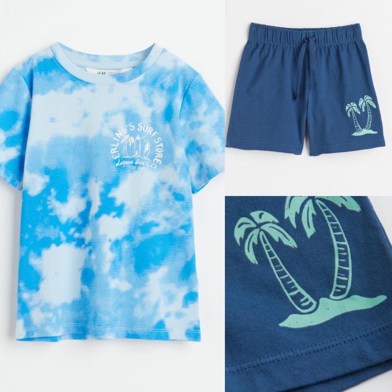 Легкие летние модные комплекты на мальчишек от H&M цвет комбинированный 100% хлопок, тонкий летний трикотаж H&M Англия 4-6лет(110/116см) Футболка ширина 32см длина 48см шорты ширина 26,5см, длина 36см 6-8лет (122/128см) Футболка ширина 36см длина 51см плечи 31 шорты ширина пояса 28,5см, длина 37