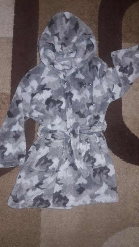 Теплий м'який махровий халат. З капюшоном і кишенями. Йде на 4-5 років Довжина-59 см На ріст до 116 см
