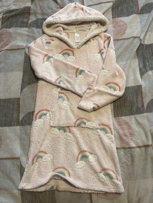 Дитячий халат-сукня з капюшоном махровий Продам теплий та зручний халат-плед для дівчинки 12-13 років. Колір - ніжно-рожевий, прикрашений веселками та хмаринками. Мʼякий флісовий матеріал, дуже приємний на дотик. Усередині капюшон має теплу підкладку «під овечку». Є велика зручна кишеня спереду. Довжина - до колін, зручний фасон. • , Розмір: підходить на вік 12-13 років (можу зняти заміри за потреби). Стан: відмінний, без плям, пошкоджень чи затяжок. Ідеально підходить для дому, після купання або просто для затишних вечорів. Дуже теплий та комфортний!