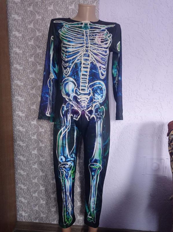 Прикольний костюм скелета, ззаду зав'язується на шиї. Стан ідеальний. Склад:91% поліестер,9% еластан. Заміри: ПОГ-42 (гумка), ПОТ-39 (гумка), ПОБ-48 см, довжина — 137 см, крок — 70 см, Світлина на тілі немає. Пересилання.