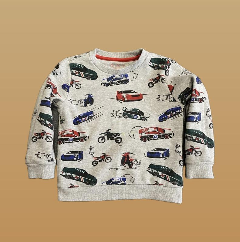 Стильний та зручний светр світшот для хлопчика у Принт машинки. Фото на тілі немає Комір круглий Рукави довгі на них манжети в рубчик Принт машинки(транспорт) Є фліс Тягучий щільний / Підійде на 4-6 років орієнтуйтеся по замірах Довжина 42 см) Плечі 28 см) Пог 37 см) Піт 36 см) Знизу 33,5 см) рукав 39 см/ З нюансів-є плями ,але за рахунок принту їх непомітно,оцінено дешевше/ Продається без повернення/