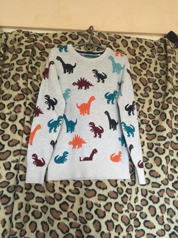 Шикарная кофточка серого цвета с разноцветными динозаврами, Knit Design" ,фирменная,натуральная,низ кофты и низ рукавов-широкая манжет-резинка,вокруг шеи тоже манжет-резинка,длина рукава-50см.,длина кофты-53см.,ширина в плечах-36см.,изнутри кофта зеленого цвета с динозаврами.