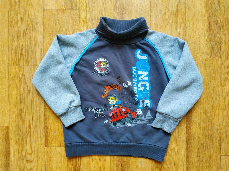 Тёплая кофта с высокой горловиной. Цвет серый из светло-серым. Возле горловины есть несколько малюсеньких дырочек, как ткань побита иглой. В носке не видно, дальше не рвутся. Показала на последнем фото. Очень мягкий и комфортный для ребёнка. Горловина хорошо облегает шею. На бирке указано 80 см, но мы носили где-то из роста 90 до 100 см. Ориентируйтесь на замеры. Замеры: длина 36 см под мышками 31,5 см длина рукава от горловины 37 см.