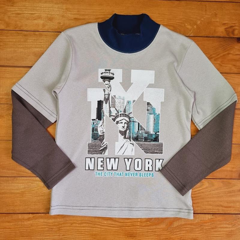 Стильний джемпер для хлопчика з ефектом "подвійного" рукава. Рукава, горловина і низ вироби з декоративною строчкою. Оформлений накатом "Нью Йорк" Колір: Сірий; Полотно: Інтерлок без начісування; Склад: 100% бавовна; Оформлення: Пряма трансферна друк (Накат) ; В наявності ріст 122, 128, 134