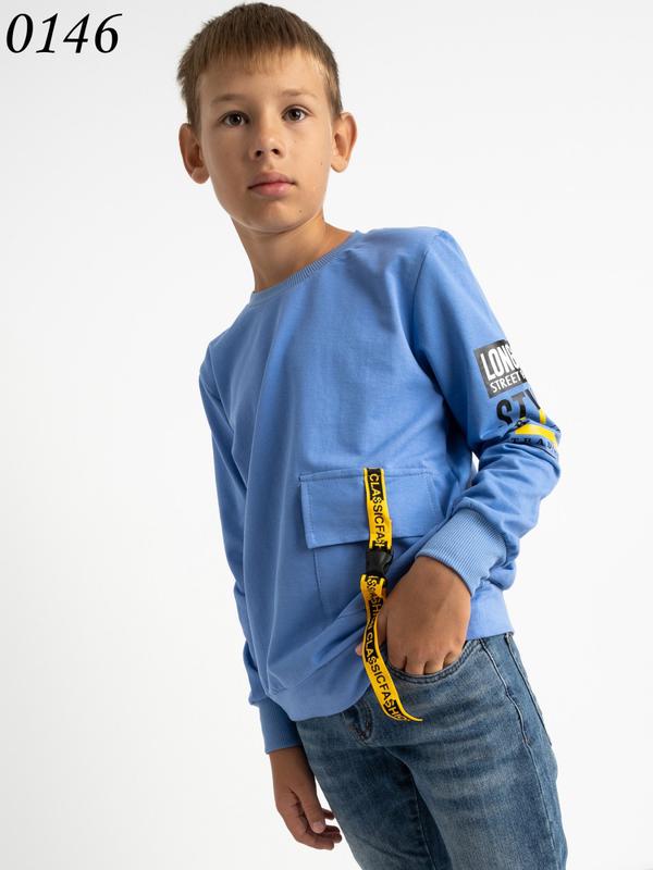 Трикотажный голубой батник На фото мальчик ( 11 лет , рост 150 см) одет в размер 146. Размер ( рост ) : ,140,146,152 *соответствуют возрасту 8-12 лет*