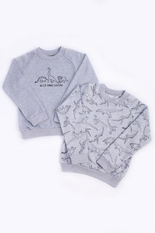 Комплект выполнен из футера с начесом. Полотно натуральное, теплое, приятное к телу. Один свитшот из набивного полотна с динозаврами, другой - из однотонного с накатом динозавры по переду. Модель с округлой горловиной, манжеты, горловина и по низу контрастный приклад из стрейча. Рукав реглан. Модель хорошо подойдет к спортивным брюкам, джинсам.