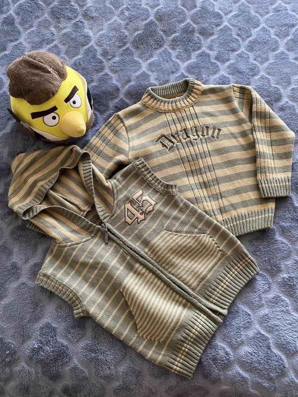 Підійде на 3-6 років/ Теплий набір двійка для хлопчика/ Светр вільного фасону заводського плетіння/ Жілєтка безрукавка на блискавку/ Також заводського плетіння/ Зручний,бо підходить і до школи і можна носити як святковий/ Із нюансів-місцями катишки та плями на фото вказано,у ціні враховано,продається без повернення/ Свитер-длина 40,5 см) Плечи 31,5 см ) Пог 36,4 см) Полуобхват снизу 29 см) Рукав 36,5 см) Безрукавка-длина 39 см) Плечи 37,5 см) Пог 36 см) Полуобхват снизу 30 см) Длина капюшона 30 см)