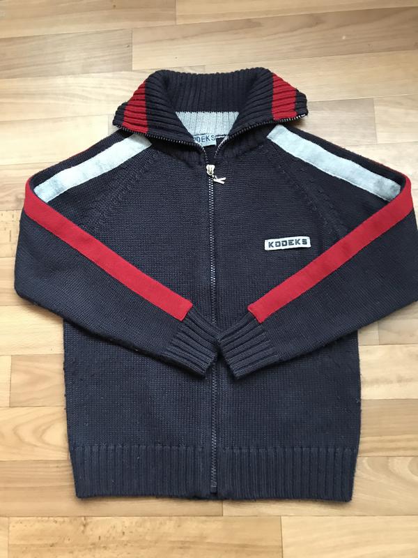 Кофта на хлопчика від бренду Kodeks.Колір синій.Розмір 130р.Модель йде під високе горло.Застібка на блискавці.Збоку маленька напис.На рукавах і на горлі смужки червоного і сірого кольору.Рукави довгі з манжетом. Склад:60%вовна,40%акрил.