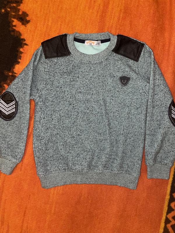 Красивый свитерок с кожаными вставками, цвет зелёный меланж, состояние отличное, есть немного мало заметных катышей Цвет как на последнем фото Длина 40 Плечи 27 ПОГ 32 Рукав 37