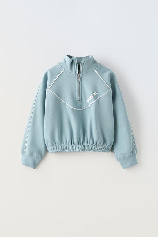 Худі з коміром і довгими рукавами . Застібається на замочок . Декоративні шви і принт з надписом спереду . Еластичний низ . Сіро-блакитний колір