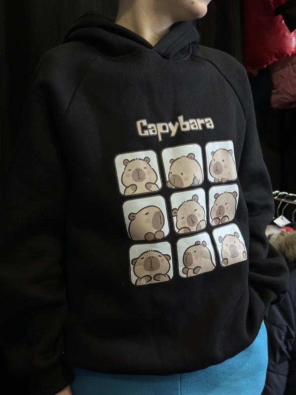 Худі з Капіпарой 😍 Улюблена тваринка багатьох діток 🫶🏻 Худі на флісі та з капюшоном, у чорному кольорі. Розміри у наявності: 146, 164 Ціна: 1020 грн