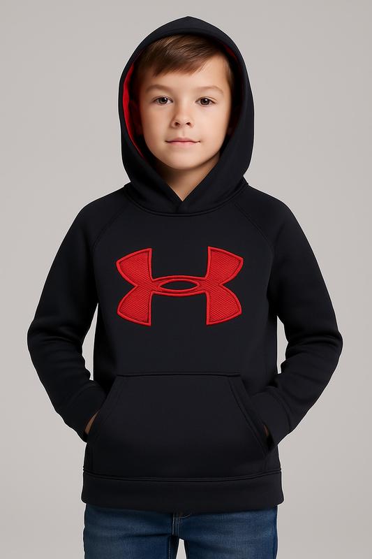 Фірмове худі Under Armour для хлопчика (розмір YSM / JP/P, орієнтовно на 7–9 років). Чорне, з великим червоним логотипом на грудях. Усередині — м’який фліс, зберігає тепло в холодну погоду. Капюшон із червоною сітчастою підкладкою, зручна кишеня «кенгуру» спереду. 📏 Заміри: • Довжина по спині: 51 см • Рукав від горловини: 59 см • Напівобхват грудей: 41 см