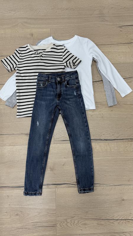 Стан як новий Джинси 122 розмір Довжина 71 Крок 51 Талія 24 Посадка 24 Лонг H&M-7-8 Довжина 48 Рукав від плеча 42 Ширина 32 Футболка H&M-7-8 Довжина 46 Ціна за все