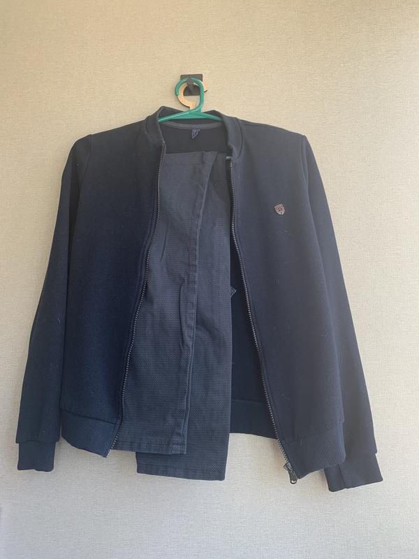 Дуже класний кардиган у темно-синьому кольорі, чудова якість. Не витягується, чудово тримає форму. У подарунок віддам темно-сині штани зріст 158, але син носів разом із кардиганом, штани повномірні.