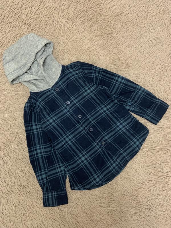 Сорочка/кофта з каптуром. Колір синій у клітинку. З бавовняною м’якою підкладкою, на ґудзиках. Заміри: Довжина рукава 31,5 см Від пахви до пахви у лежачому стані 29 см Довжина 38,5 см