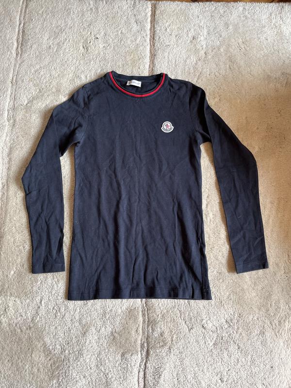 Футболка з довгим рукавом Moncler темно-синя з декоративною. червоною смужкою на гумці горловини. Оригінал, куплений в Італії в мультибрендовому магазині. Ширина плеча-8 см, довжина рукава-57 см.,ширина по пахвах-39 см.,ширина внизу-39 см.,довжина по спинці-60 см. Склад: 100% бавовна Доставка: НП або Укрпошта.