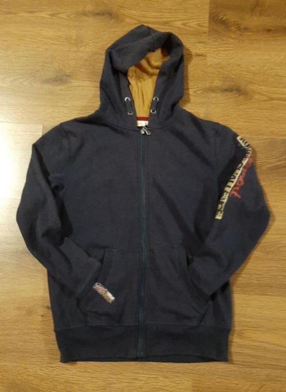 Кофта на молнии с капюшоном. Подойдет для будничного использования. Дефектов нет. Минимальные следы носки в виде мини-катиков, если с близкого расстояния присмотреться.