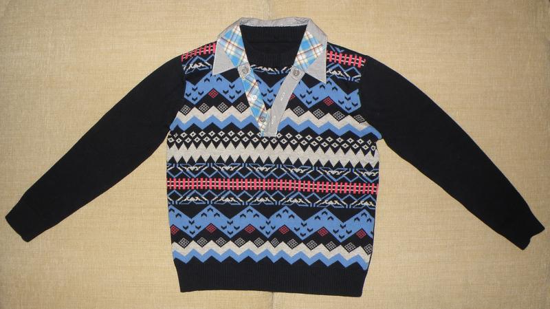 Джемпер з цікавим комірцем-обманкою, фабричний Китай, б/в, розмір 6 років. Склад: 100% бавовна, в'язка середньої щільності, м'яка, не колеться. Верхній комірець можна відстібнути. Стан дуже хороший, без дефектів. Ціна - 100 грн. Виміри: довжина - 49 см, ширина під пахвами - 42 см, рукав від плеча - 48 см.