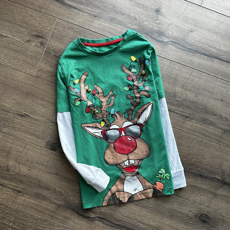 Классный новогодний реглан фирмы F&F. На возраст 7-8 лет. Длина 51,5 см, плечи 31,5 см, рукав 45 см.