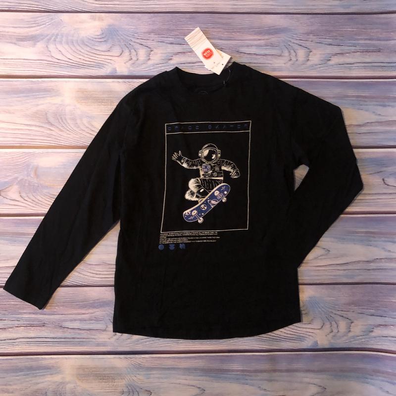 Стильний лонгслів, трикотажна кофта. Якість відмінна! Не тоненький, достатньо щільна тканина. 11 років (146 см). Склад: 100% котон. Заміри: Довжина від плеча спереду 58 см, ззаду 61 см.. Ширина по плечам 42 см. Ширина в грудях 43 см. Рукав від плеча 47 см, від пахв 43 см. Дивіться всі мої оголошення, в наявності багато одягу! Також читайте інформацію про мене в моєму профілі!
