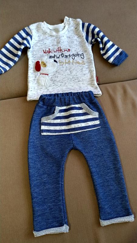 Костюмчик на 2 р. Стан дуже хороший. Сезон весна-осінь. Кофтинка: довжина 34 см, ширина 27 см. Рукав від горла 22.5 см. Штани: довжина 45 см, пояс 20 см, резинка м'яка, добре тягнеться.