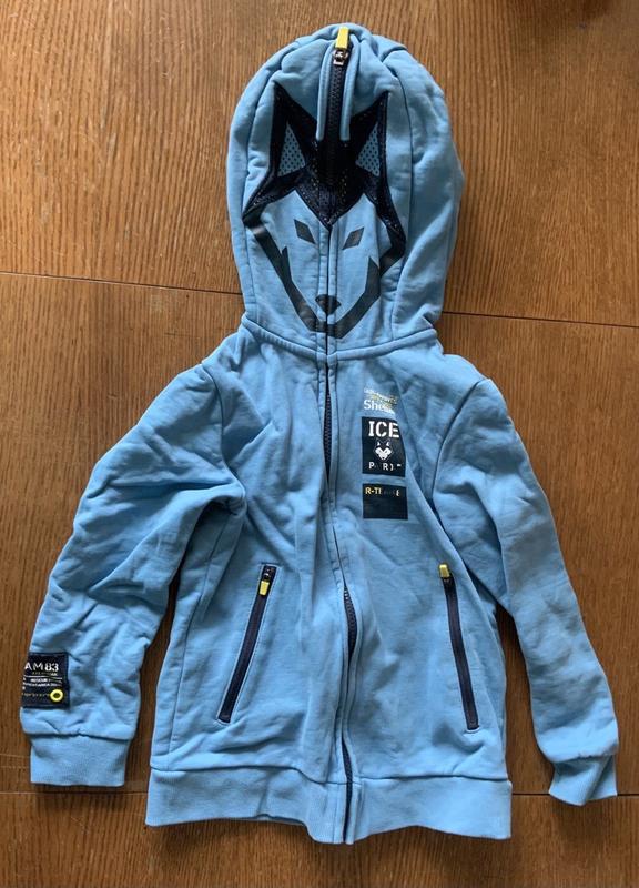 Толстовка у відмінному стані. Оригінальна деталь - капюшон можна застібати повністю, стає видно малюнок вовка, є вирізи для очей. Фурнітура якісна. Склад: 100% бавовна, з начосом (фото). Матеріал щільний, якісний. 2 кармани. Колір блакитний, плям, розводів, дефектів немає. При купівлі 3 речей знижка 10%. Відправлю поштою або зустріч у Києві