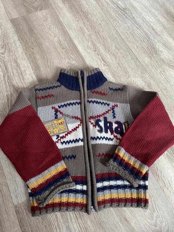 Тепла,виробництво Туреччина.Цікаво і стильно виглядає.Під джинси,як маленький моднявчик буде.Розмір вказаний 2 роки,92 см.,але не відповідає дійсності,бо довгий рукав.Десь роки 3-4.В дуже гарному стані,не витягнута і не деформована.Питайте!Дякую за перегляд)