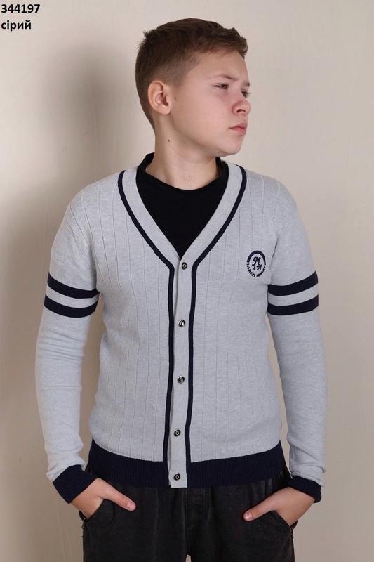 Дитяча кофта на хлопчика. Матеріал: В'язка. Склад: бавовна 100%. Розміри та заміри виробу: Розмір 120 (на зріст 122-128см): довжина кофти 42см, довжина рукава від плечового шва 45см, ширина по лінії грудей 34см, ширина плечей 29см. Розмір 150 (на зріст 152 - 158см): довжина кофти 50см, довжина рукава від плечового шва 53см, ширина по лінії грудей 40см, ширина плечей 34см. Розмір 160 (на зріст 158 – 164см): довжина кофти 54см, довжина рукава від плечового шва 55см, ширина по лінії грудей 42см, ширина плечей 36см.