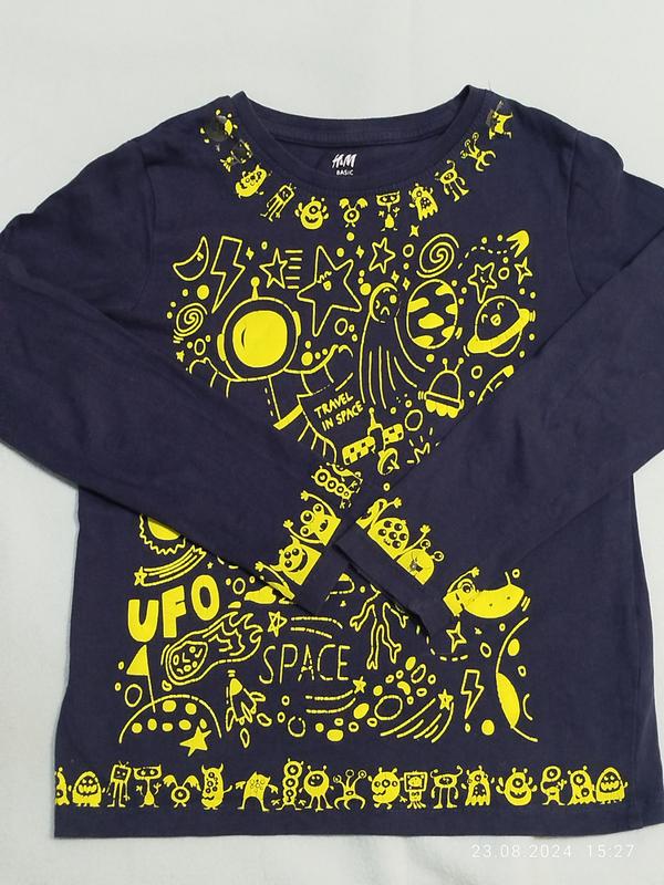 Мінімальне замовлення у продавця на 100 грн. Дуже класний джемпер H&M темно-синього кольору в дуже гарному стані, є невеликі потертості на малюнку. Підійде на дитину 6-8 років. Довжина виробу по спинці від плеча 47 см, напівобхват грудей 35 см, довжина рукава 44 см. Тканина бавовна тягнеться. Модель 4578Т